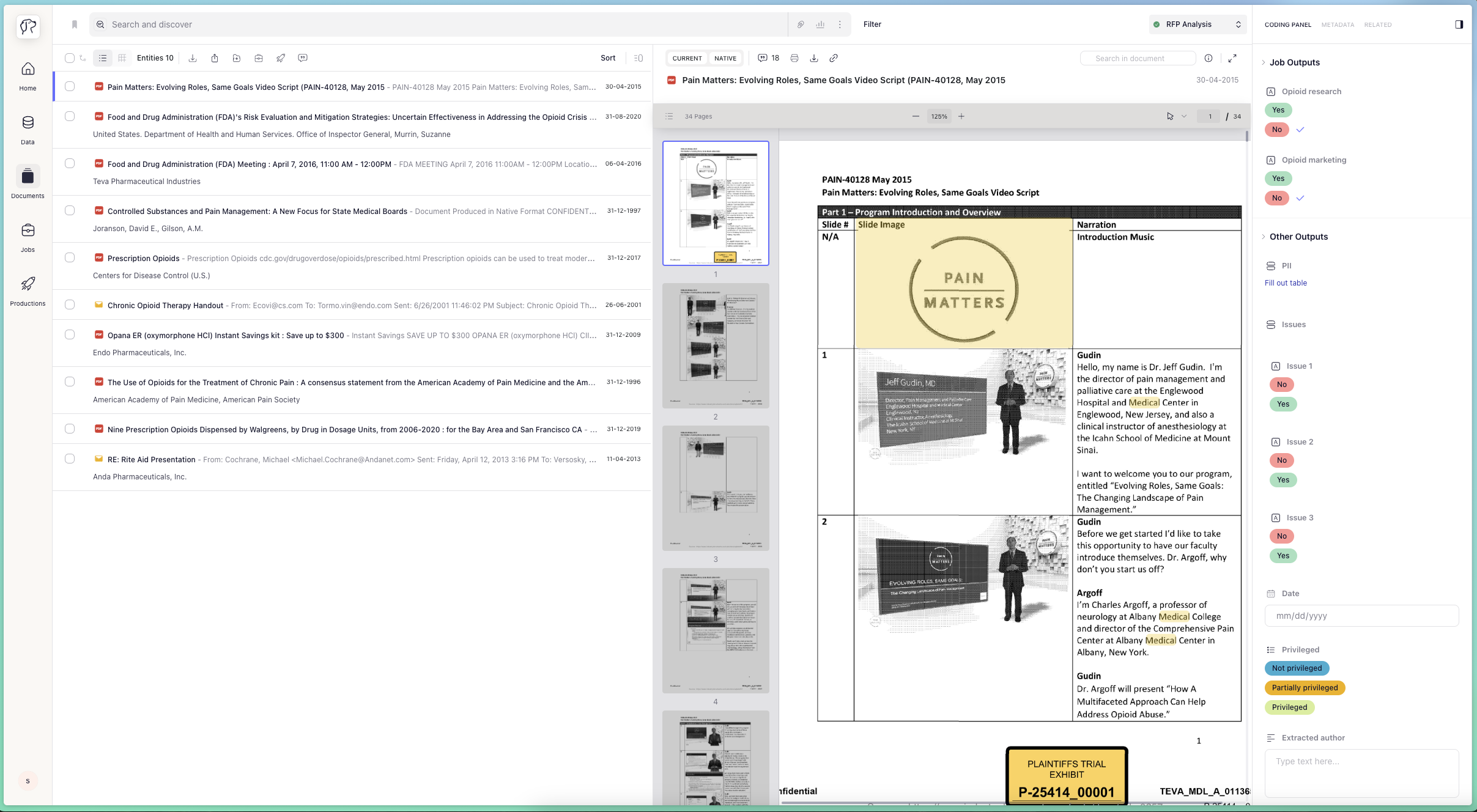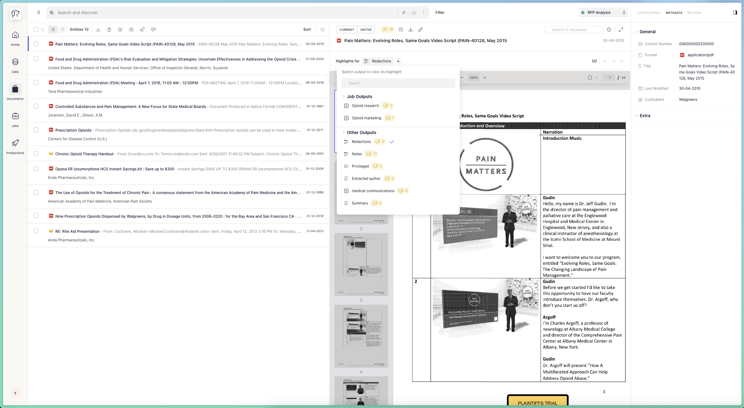 The platform handles the entire eDiscovery process, from data processing to production. This includes indexing, searching, data analysis, classification, information extraction, aggregation, text generation, tagging, redactions, productions, and exports.