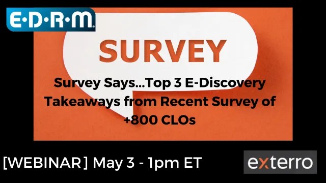 Webinar: Survey Says...Top 3 E-Discovery Takeaways from Recent Survey of +800 CLOs Date: Wednesday, May 03, 2023 Time: 12:00pm CST Register: Click Here to Register Summary Survey Says...Top 3 E-Discovery […] |